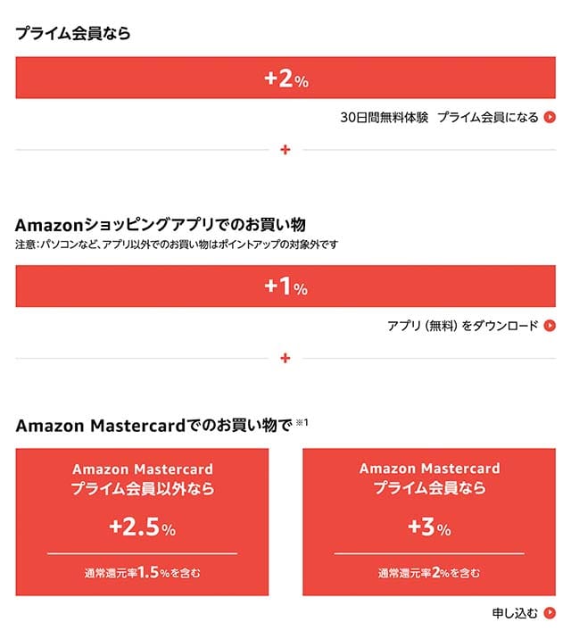 「プライム会員加入+「Amazonアプリ利用」くらいであれば比較的簡単に条件が満たせ、3%分のポイント還元受けられるのでオススメです。