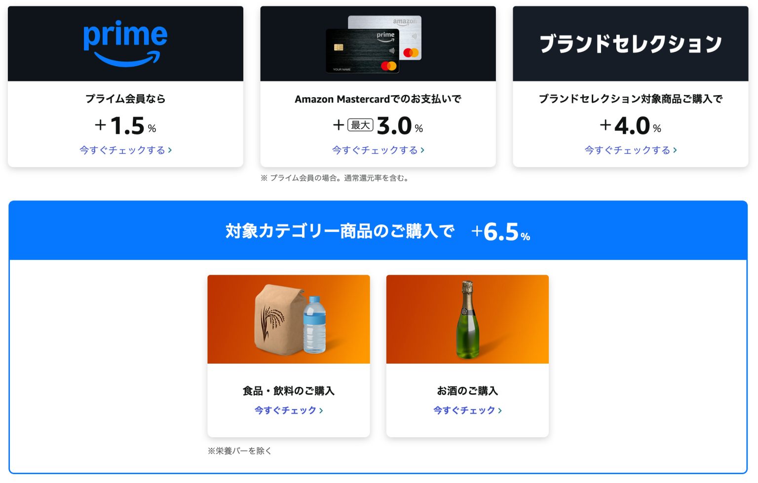 ポイントアップの方法は色々とありますが、今回のプライム感謝祭ではプライム会員になることが必須なので、ひとまず1.5%のポイントは会得できます。