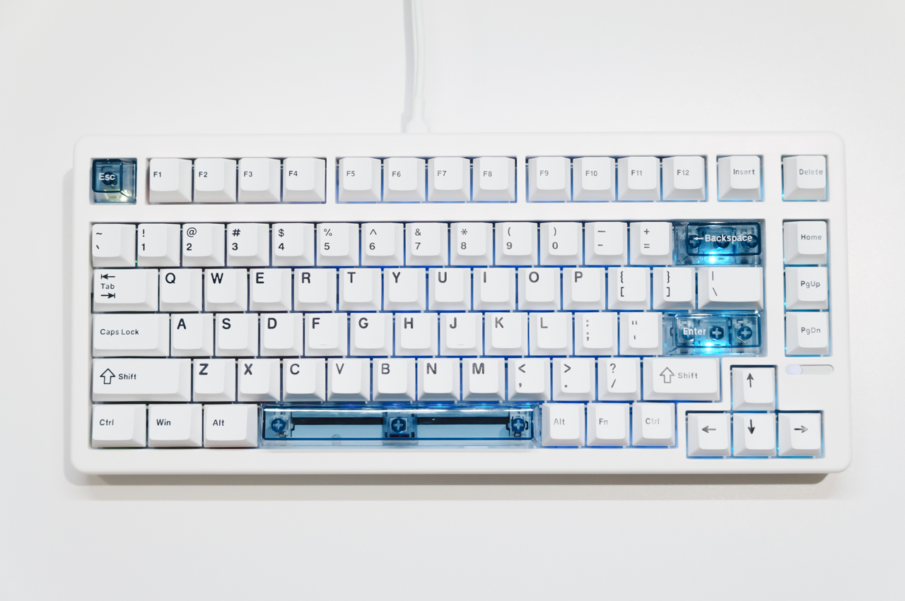 全体的には白黒でまとまったデザインですが初期状態では一部のキーがクリアなキーキャップとなっており、ちょっとしたデザイン的なアクセントとなっています。