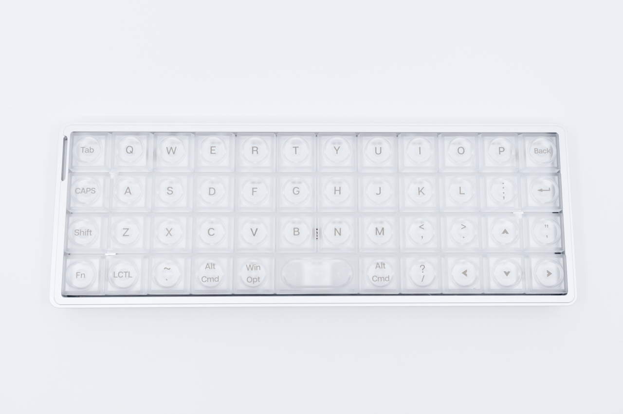 40%のコンパクトなレイアウト、アルミニウムケースの高級感ある筐体、透明なキーキャップと見た目のインパクトが凄く、非常にスタイリッシュなキーボードとなっています。