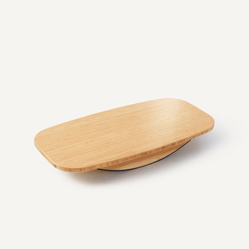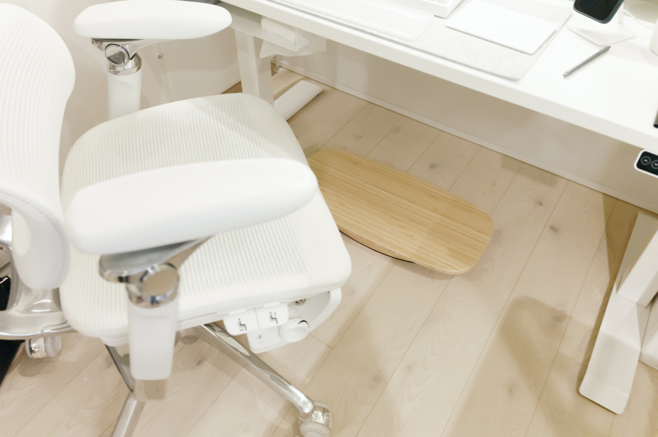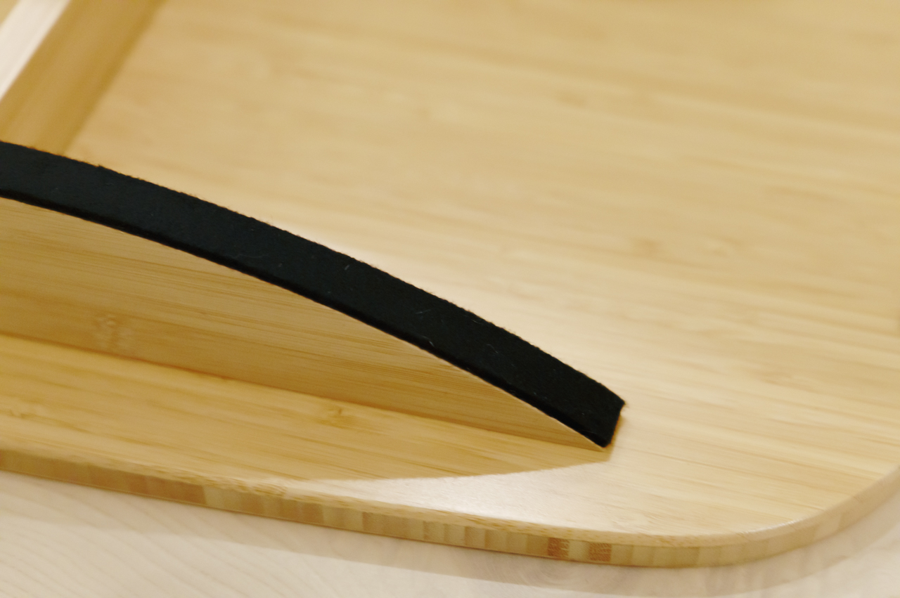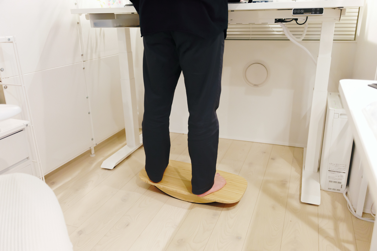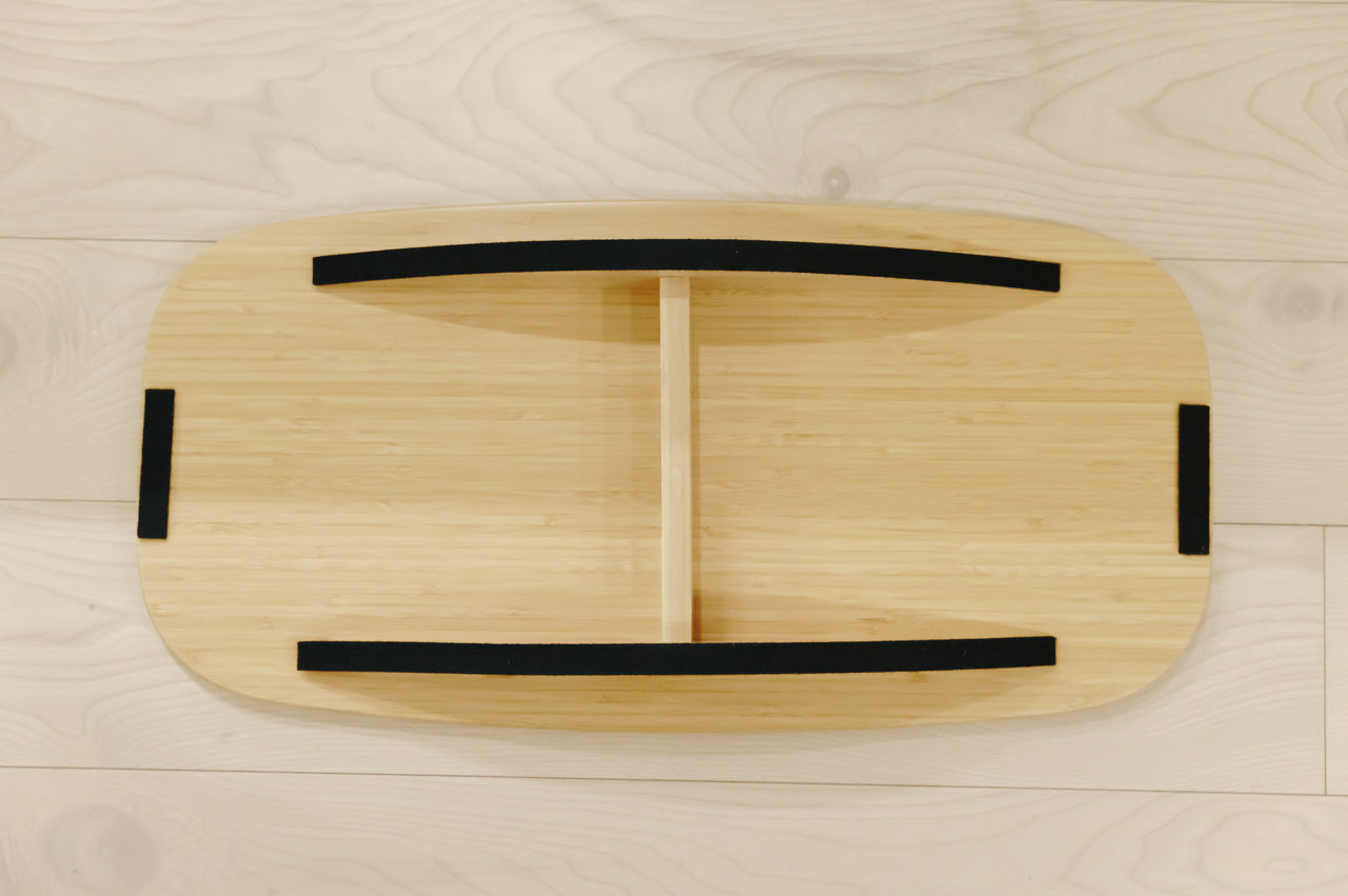 一般的な樹脂製のフィットネス器具とは異なり、家具のような温かみのある質感が特徴。スタンディングデスクでの作業中に足元で使用し、ゆらゆらとバランスを取ることで体幹トレーニングや足のむくみ解消をサポートします。