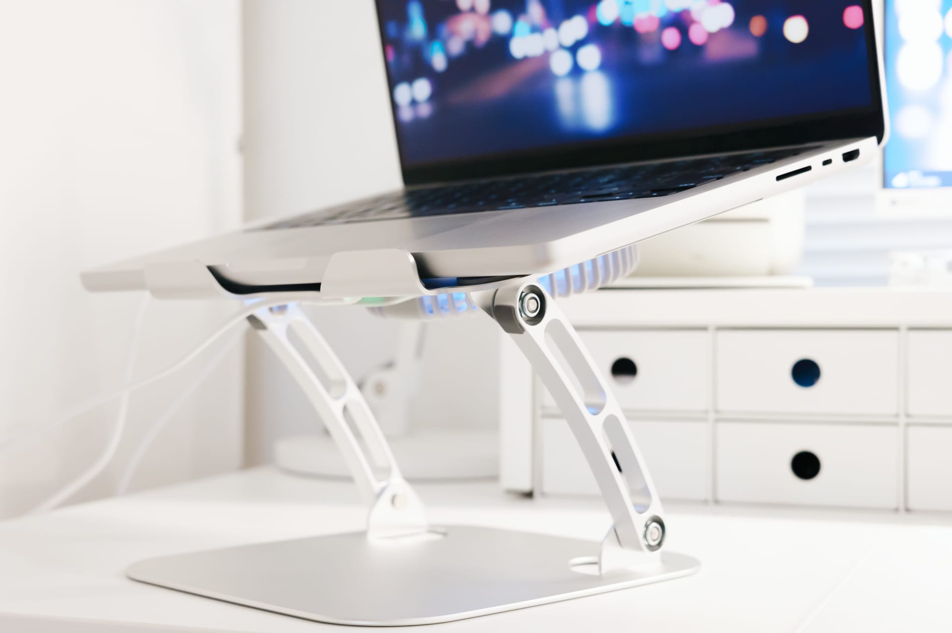 目線が上がり、首や肩などへの負担が軽減されるというのが主なメリットですが、その他にも「排熱性能を高めて、パソコンの処理能力を落とさない」という役割も。